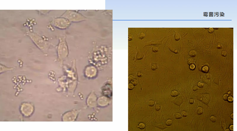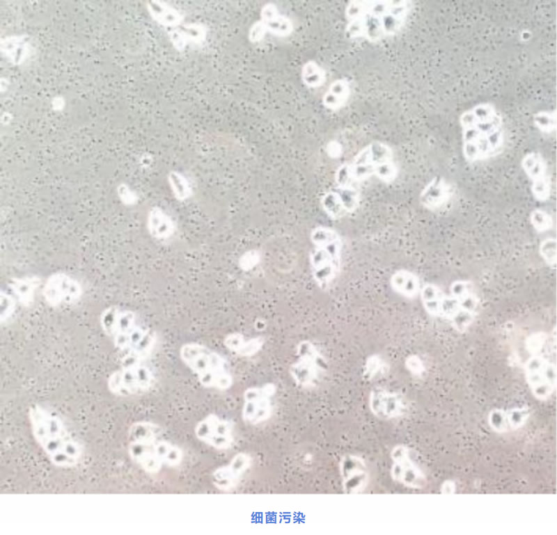 主要有白色葡萄球菌,大腸桿菌,假單孢菌、枯草桿菌等;細(xì)胞被污染后培養(yǎng)基會(huì)很快變黃變渾濁,在顯微鏡下可觀察到細(xì)胞間有細(xì)小菌體移動(dòng),在數(shù)小時(shí)內(nèi)會(huì)出現(xiàn)細(xì)胞脫落漂浮,培養(yǎng)液中呈細(xì)沙狀。這種污染通常是操作不規(guī)范或無(wú)菌措施不到位等引起的。