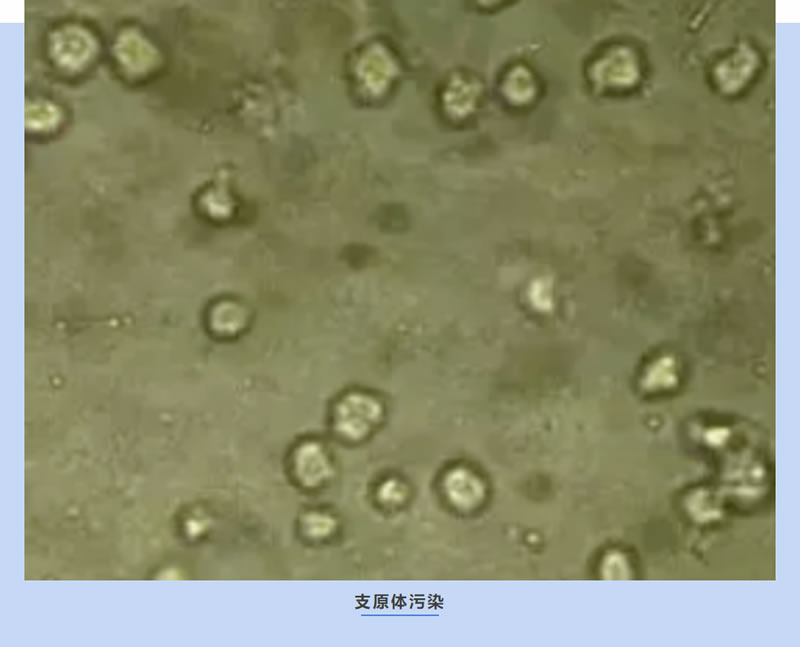 污染后培養(yǎng)液不會(huì)渾濁,在高倍鏡下可觀察到細(xì)胞間有黑色顆粒在原地進(jìn)行“布朗運(yùn)動(dòng)”,像小蟲游來(lái)游去。隨著污染加重,被污染的細(xì)胞生長(zhǎng)緩慢,細(xì)胞狀態(tài)差,空泡化嚴(yán)重,甚至還可能導(dǎo)致細(xì)胞形態(tài)的改變。污染源主要來(lái)自于血清,如果出現(xiàn)污染,更換血清。