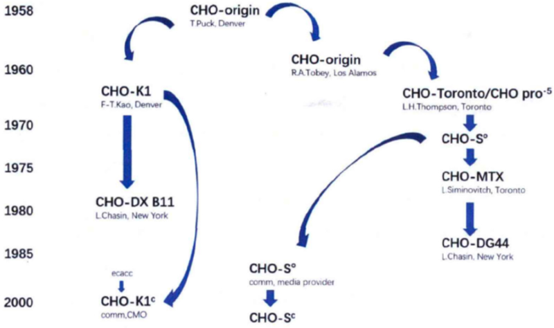 CHO細(xì)胞來(lái)自于1958年由Puck分離的具有無(wú)性繁殖性和自發(fā)永生性的中華倉(cāng)鼠卵巢細(xì)胞。CHO細(xì)胞主要包括CHO-K1, CHO-S,CHO-DXB11和CHO-DG44。
